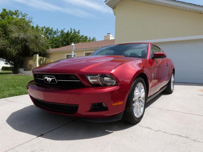 Ford Mustang V6 Premium 2012 - nádherný Ford Mustang v prříplatkové metalické barvě Red Candy, plná výbava Premium - interier v černé kůži, šestistupňová automatická převodovka, tempomat, klimatizace, Ambient Ligting, MyColor, Microsoft Sync, chromovaná litá kola, třístupňově nastavitelná tuhost řízení, denni sviceni, sledování tlaku v pneu, mlhová světla atd. Odkaz na Window Sticker tohoto vozu: http://fordlabels.webview.biz/webviewhybrid/WindowSticker.aspx?vin=1ZVBP8AM8C5233066.